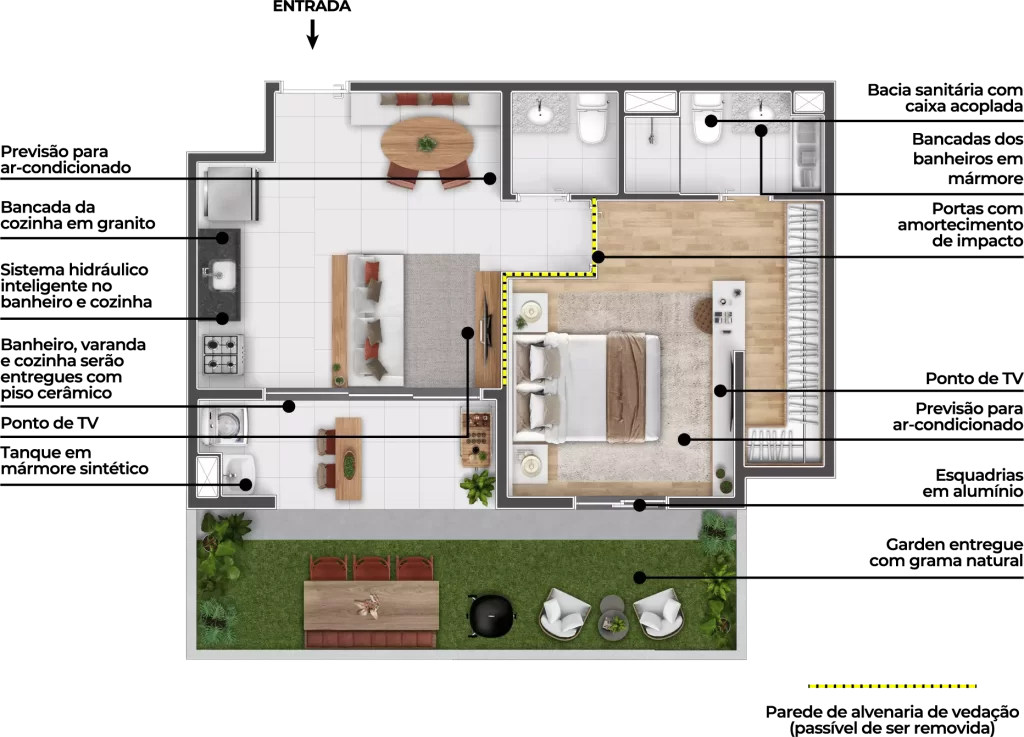Todos os apartamentos possuem varanda, e as unidades térreas contam com garden exclusivo.