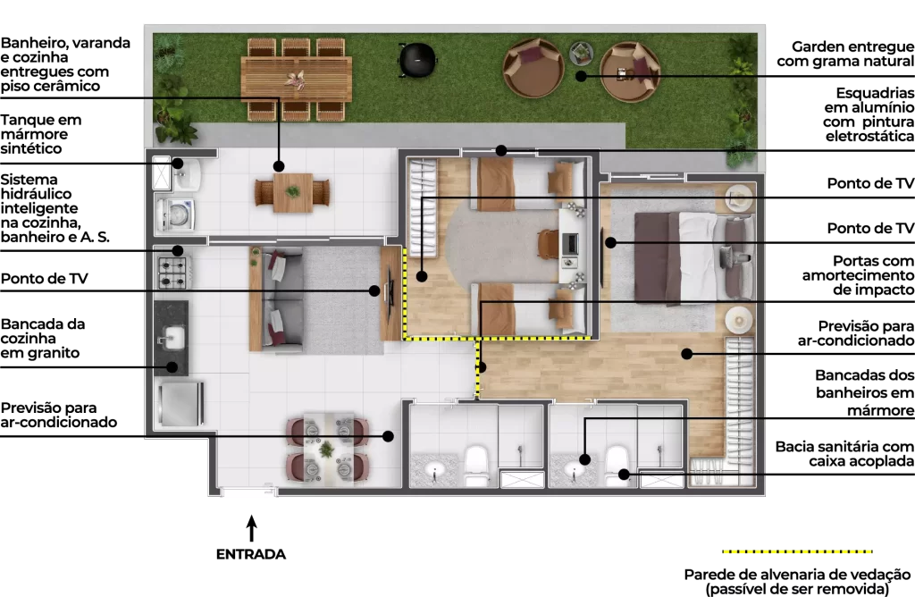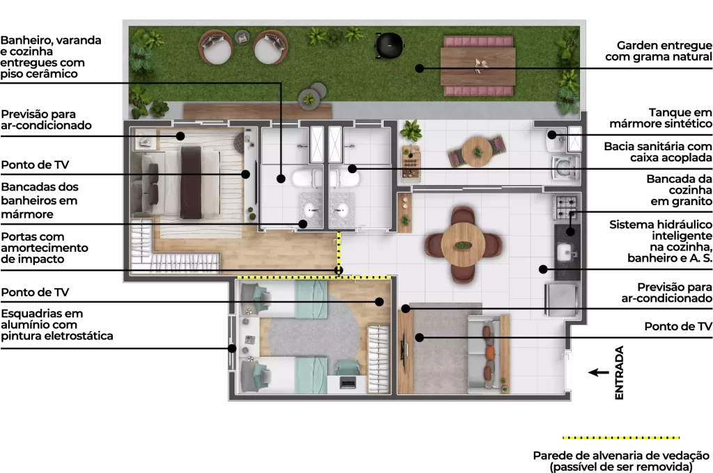 Todos os apartamentos possuem varanda, e as unidades térreas contam com garden exclusivo.